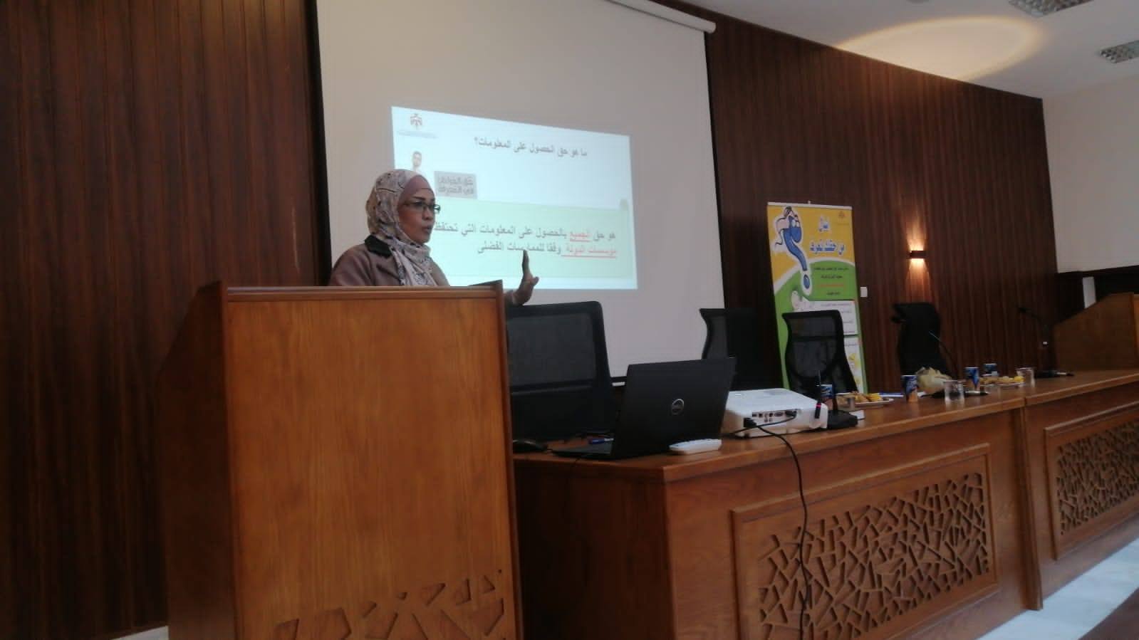 وتطرّقت النعيمات إلى القوانين الناظمة للحق، وفي مقدمتها قانون ضمان حق الحصول على المعلومات رقم 47 لسنة 2007 وتعديلاته، مؤكدة أهمية الإفصاح الاستباقي من قبل المؤسسات الحكومية عن المعلومات والبيانات المتاحة.