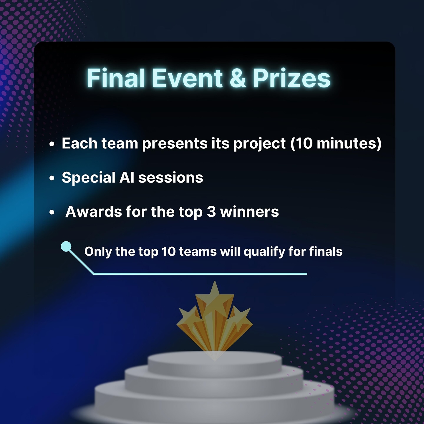 تم اختيار 10 فرق فقط من بين الفرق المشاركة للتأهل إلى المرحلة النهائية، وكان من بينها فريق Web Bases من جامعة الحسين بن طلال، حيث قدّم المشروع أمام لجنة التحكيم، وحصل على المركز الثاني على مستوى المملكة 🏆.