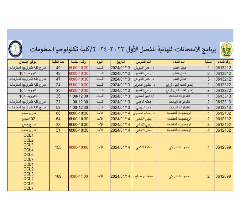 اعلان امتحان الكفاءة الجامعية للطلبة المتوقع تخرجهم على الفصل الثاني والصيفي 2024/2025 يرجى العلم بأنه تقرر عقد الامتحان يومي الثلاثاء والاربعاء 13 و 14 /5 / 2025 وحسب البرنامج المرفق ادناه الطلبة المتوقع تخرجهم ولم ترد اسمائهم مراجعة مركز التطوير الأكاديمي وضمان الجودة / دائرة الاعتماد وضمان الجودة الطلبة الواردة اسمائهم وتقدموا للامتحان على الف ..