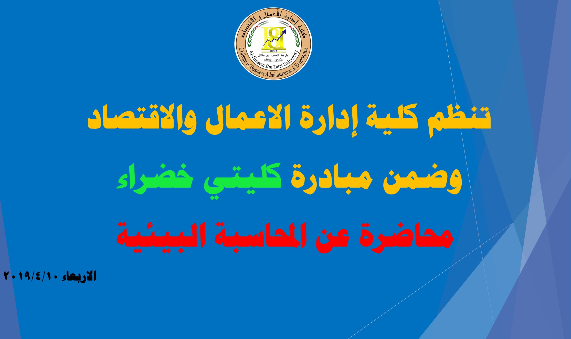 أقيمت في كلية إدارة الأعمال والإقتصاد، وضمن (مبادرة الكلية الخضراء) يوم توعوي تم فيه تقديم محاضرتين، قدمها الدكتور عماد القيسي المحاضر في كلية إدارة الأعمل والإقتصاد، والرائد يسري البدور مدير العمليات في مديرية دفاع مدني معان.