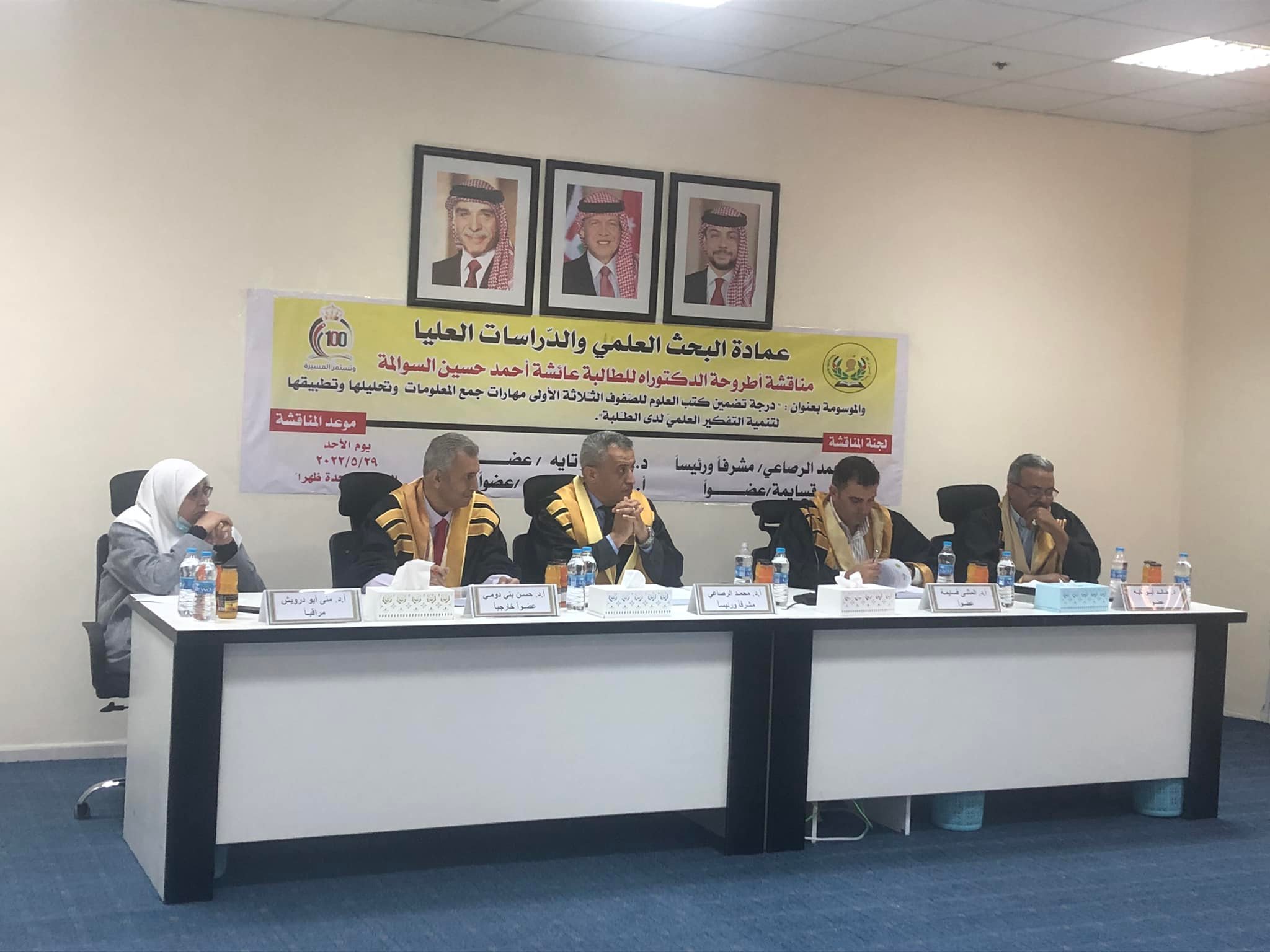 تمت مساء اليوم الأحد الموافق ٢٩/٥/٢٠٢٢ مناقشة أطروحة الدكتوراه في قسم المناهج العامة للطالبة عائشة السوالمة والموسومة ب"درجة تضمين كتب العلوم للصفوف الثلاثة الأولى مهارات جمع المعلومات وتحليلها وتطبيقها لتنمية التفكير العلمي لدى الطلبة