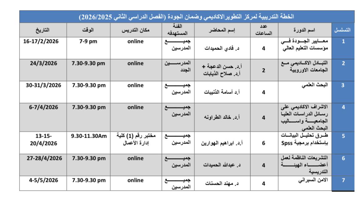 وتأتي هذه الخطة التدريبية في إطار حرص الجامعة على الارتقاء بمستوى الأداء الأكاديمي والبحثي، وتعزيز ممارسات الجودة والتطوير المستمر في العملية التعليمية بما ينسجم مع المعايير الوطنية والدولية في التعليم العالي.